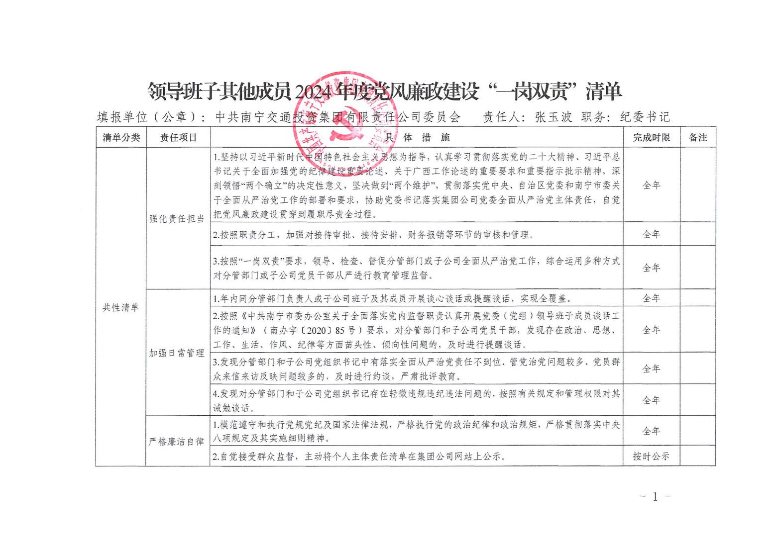 领导班子其他成员2024年度党风廉政建设“一岗双责”清单(一)