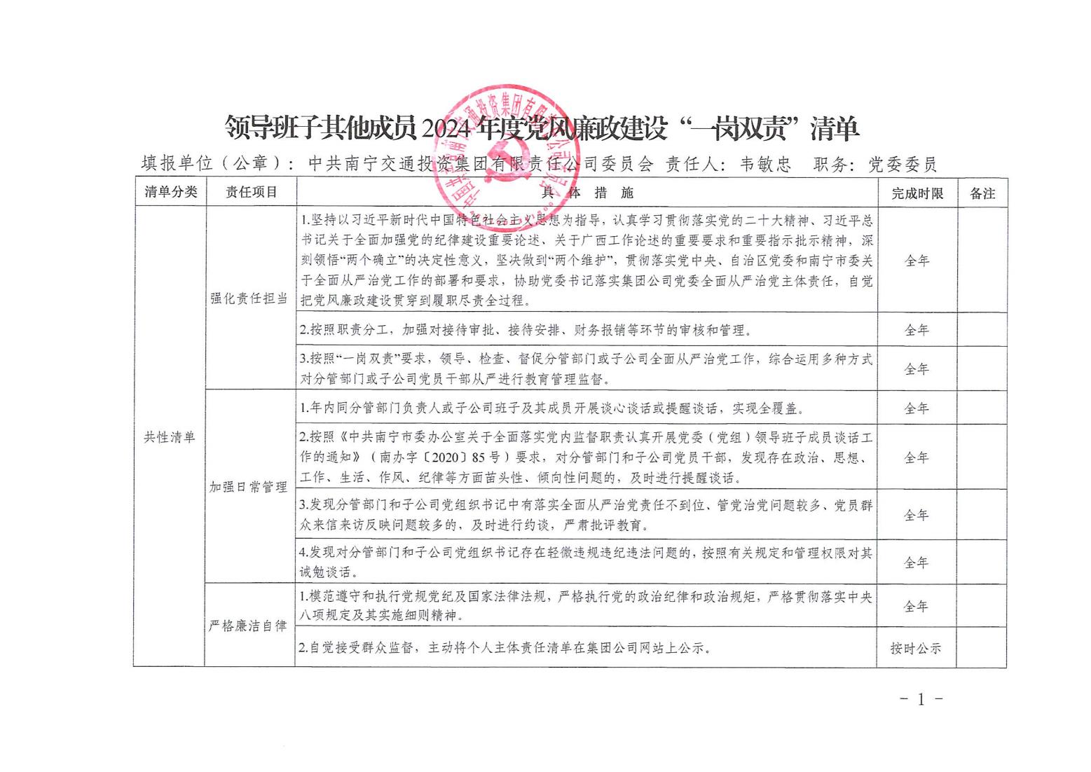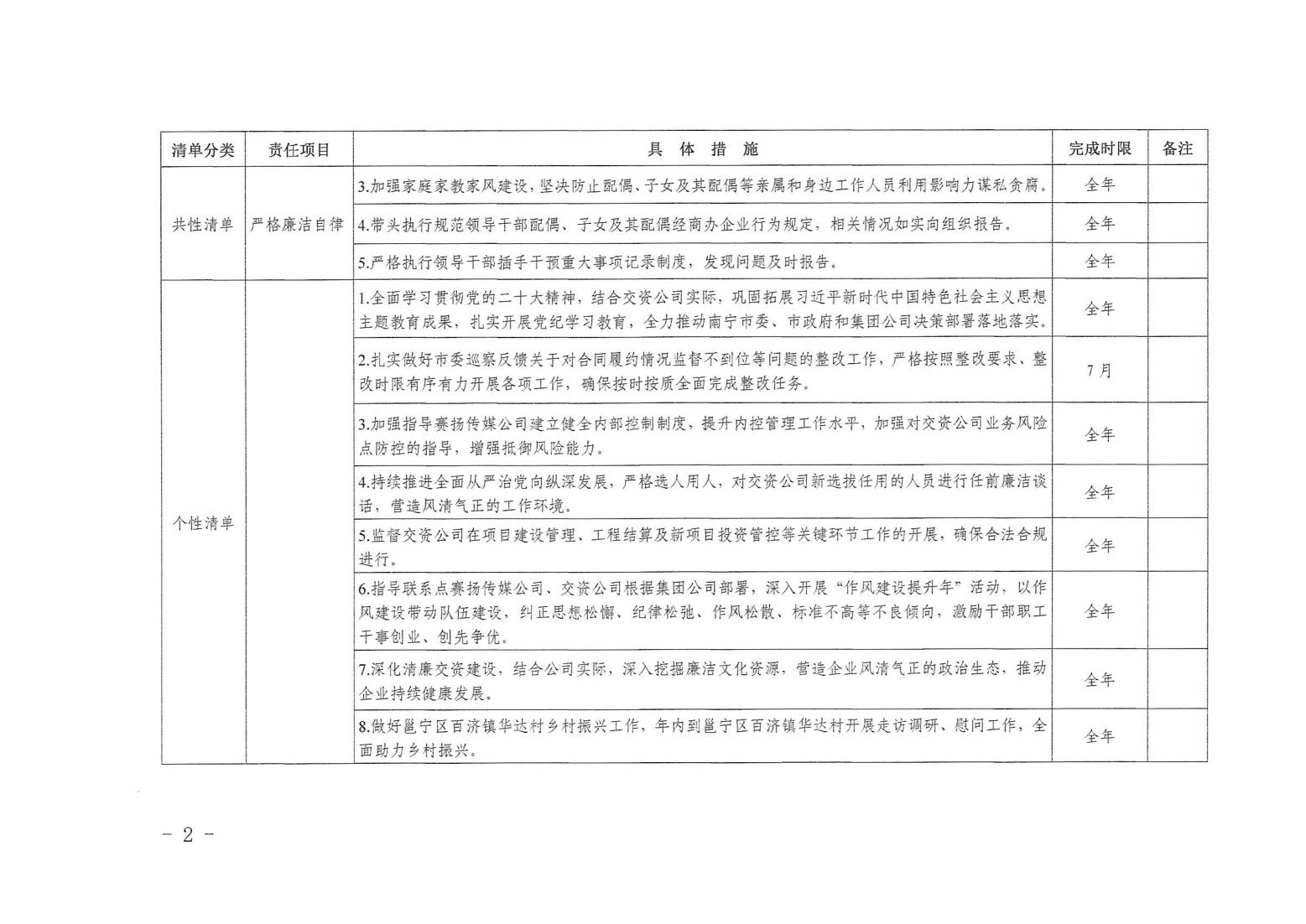 领导班子其他成员2024年度党风廉政建设“一岗双责”清单(七)