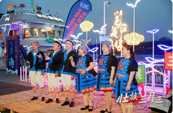 “三月三”假期,南宁旅发公司在民生旅游码头邕江夜游现场开展对唱山歌活动,身穿民族服装的阿哥阿姐们与现场的市民游客对唱山歌,以歌会友,表达节日的祝福,大家在欢声笑语中共同感受广西“三月三”特色文化的魅力。