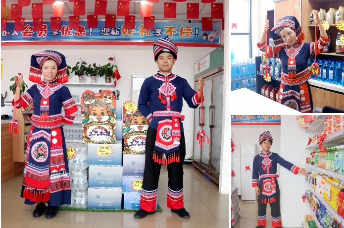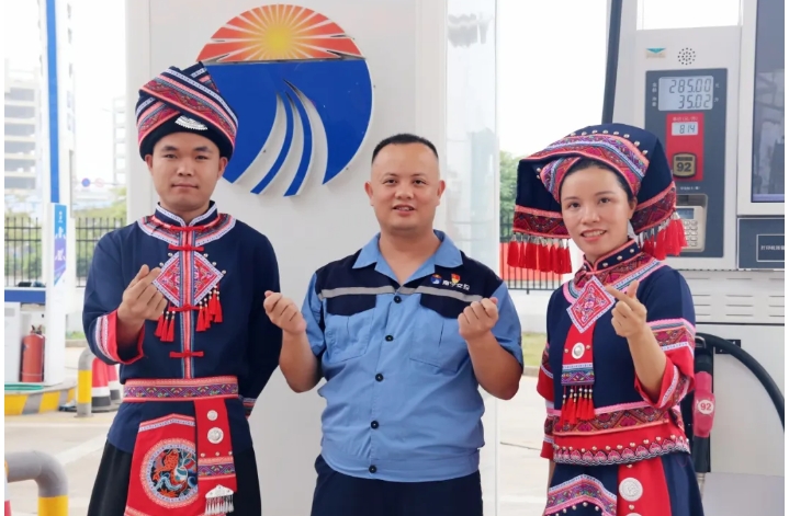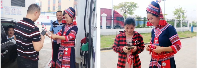 在贵义加油站,员工们穿上壮族传统服饰为客户服务,开展“三月三”民俗知识趣味问答,送上寓意吉庆瑞祥的绣球工艺品,与过往司乘开心互动。
