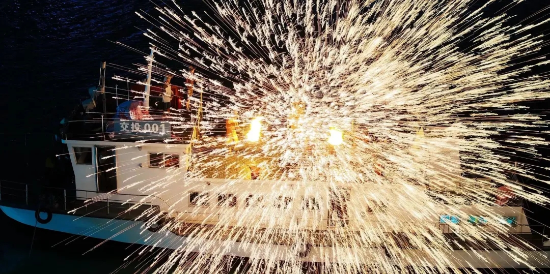 闪烁的铁花在夜空中倾泻而下,如同绚烂的烟花雨,场面颇为壮观。