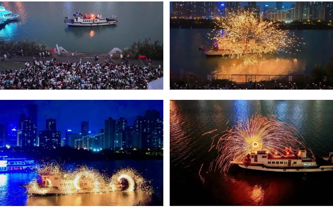 假期期间,南宁旅发公司在孔庙旅游码头为市民游客们献上这一幕“火树银花一朝落,万点星辰漫天散”的美景。