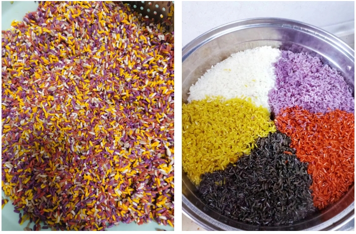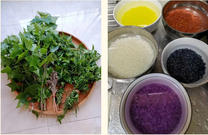 前两期展示的糯米饭为经过创意加工后的样式,而常见的五色糯米饭,是采用天然植物染成黑、红、黄、白、紫这5种颜色而成。