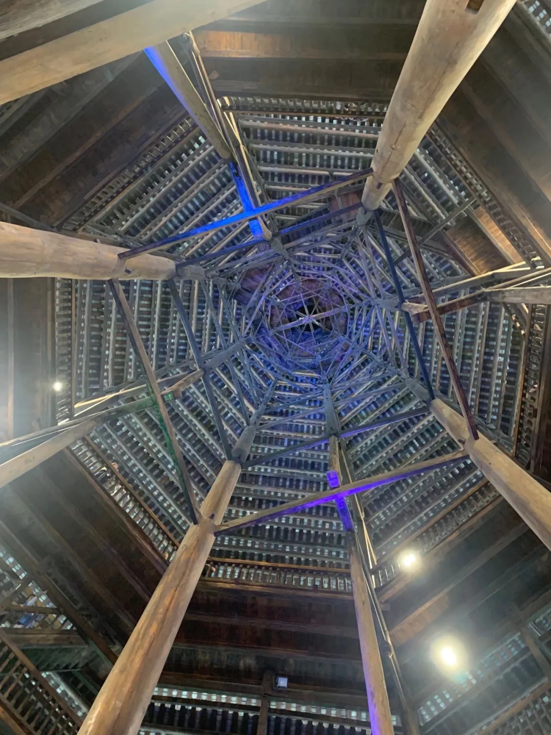 仰观闪闪魔幻,感受侗族建设的精美艺术,把疏密、粗细、刚柔等完美地结成一个整体,展现侗族工匠的精美建筑技艺。不用一颗铁钉,结构十分严谨稳固。楼内四根杉木大柱直径都超过70厘米,树龄均在百年以上,这在鼓楼建筑史上是唯一的。