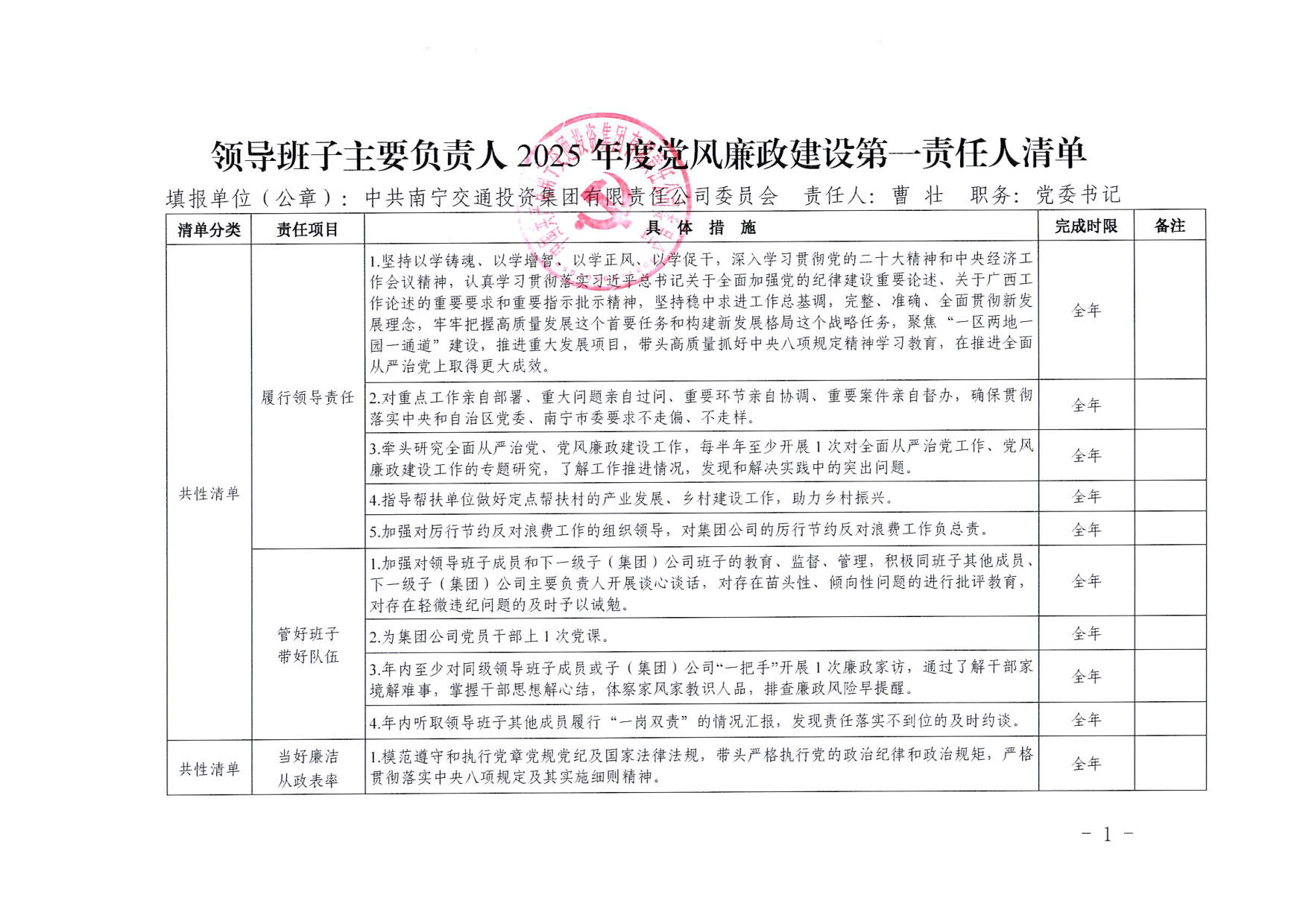 云顶赌场app 领导班子主要负责人2025年度党风廉政建设第一责任人清单