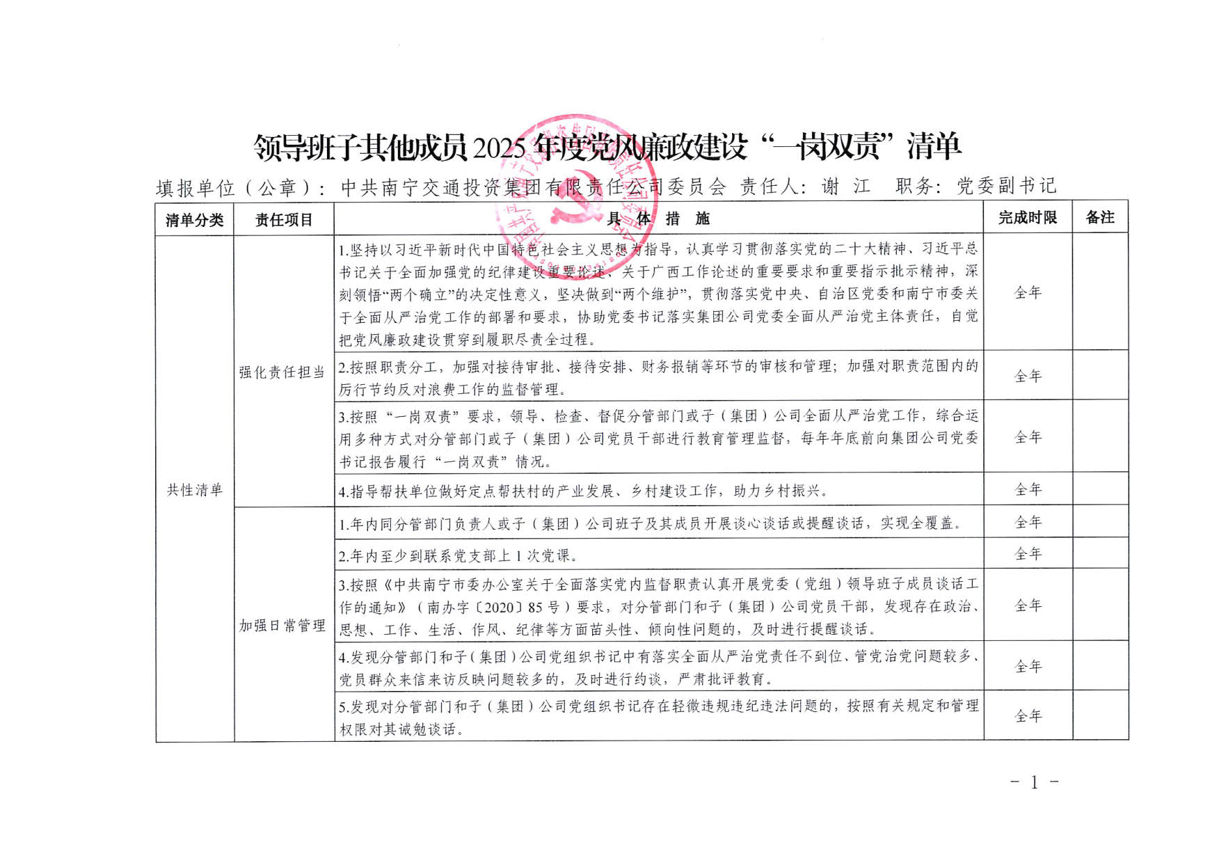 云顶赌场app 领导班子其他成员2025年度党风廉政建设“一岗双责”清单(一)