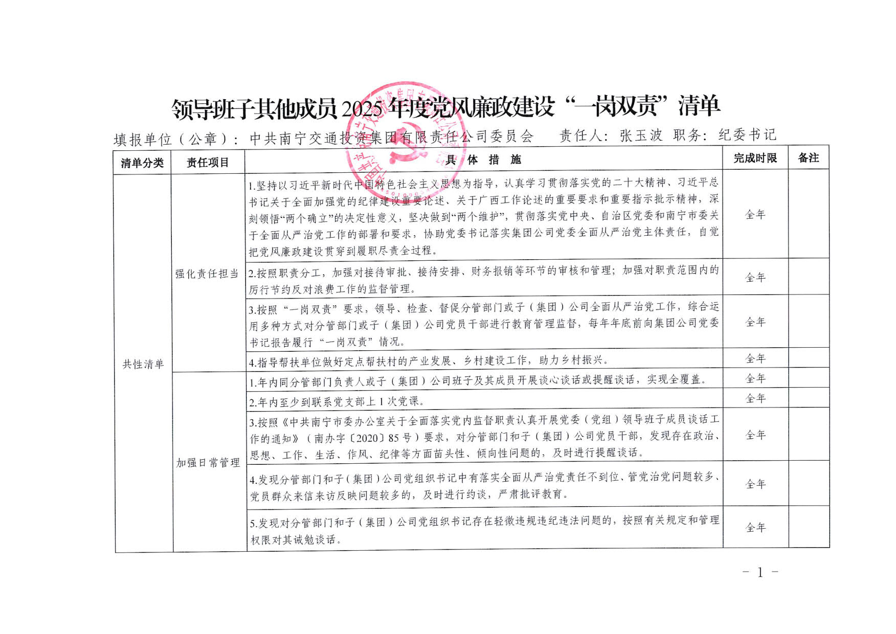 云顶赌场app 领导班子其他成员2025年度党风廉政建设“一岗双责”清单(一)