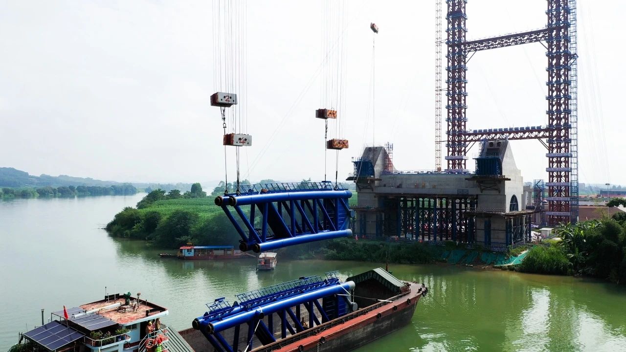 8月8日,南宁南过境线(吴圩机场至隆安延长线段)公路上正右江特大桥首节拱肋顺利完成安装,标志着这座项目关键控制性工程正式进入拱肋安装的重要阶段。