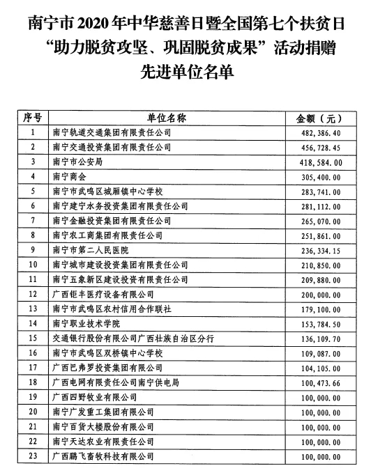 近日,南宁市脱贫攻坚指挥部发布《关于表扬南宁市2020年中华慈善日暨全国第七个扶贫日“助力脱贫攻坚、巩固脱贫成果”活动捐赠先进县(区)、单位的通报》。云顶赌场app 以456728.45元的捐款总金额在各捐赠单位中排名第二,荣获“助力脱贫攻坚,巩固脱贫成果”活动捐赠先进单位称号。