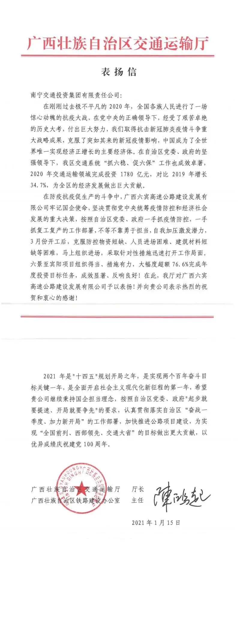 近日,广西壮族自治区交通运输厅向我云顶赌场app公司发来表扬信,对广西六宾高速公路建设发展有限公司六景至宾阳项目在防疫抗疫促生产斗争中,组织得当、措施有力,大幅度超额76.6%完成年度投资目标任务予以表扬!并向云顶赌场app公司表示热烈祝贺和衷心感谢!